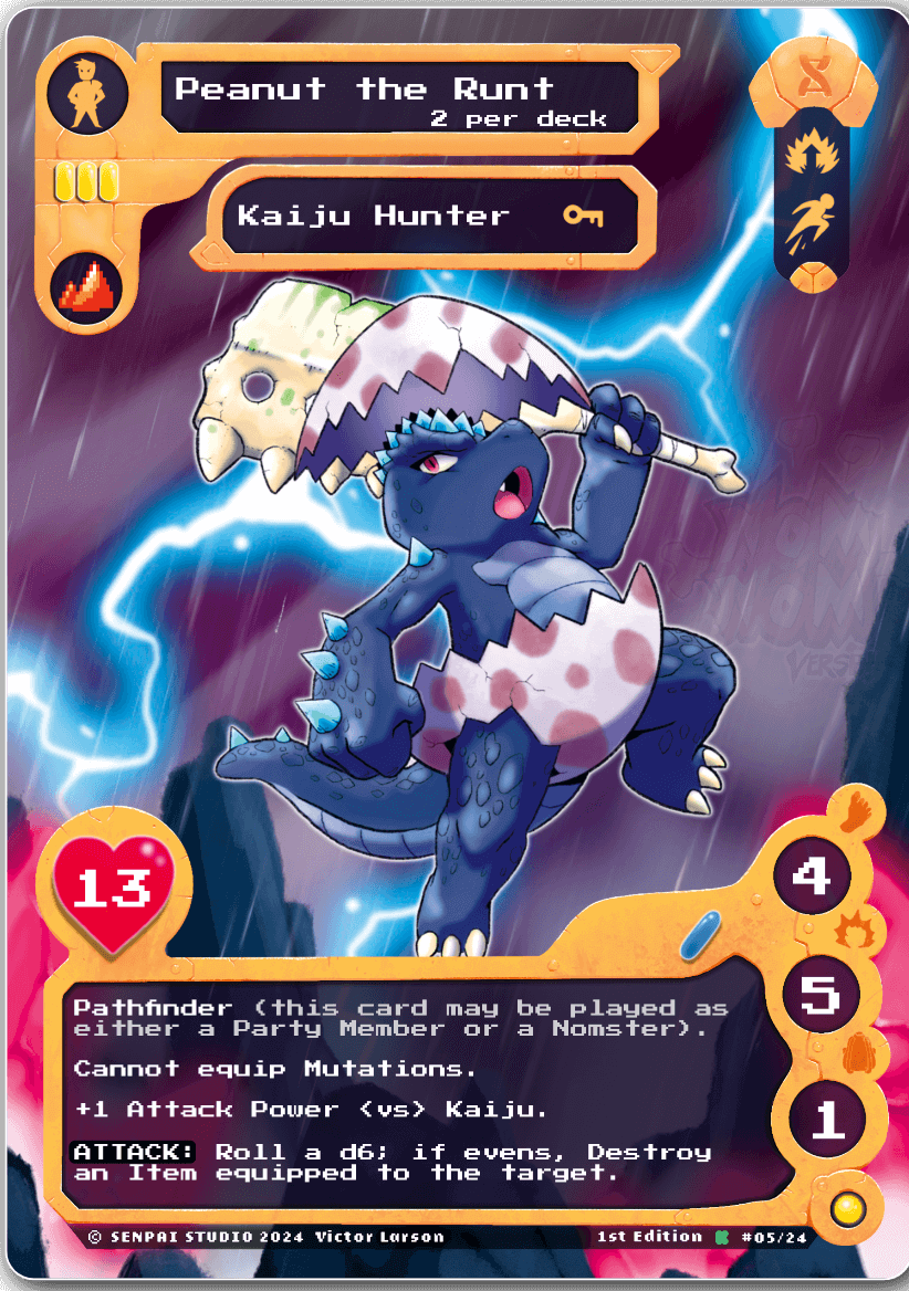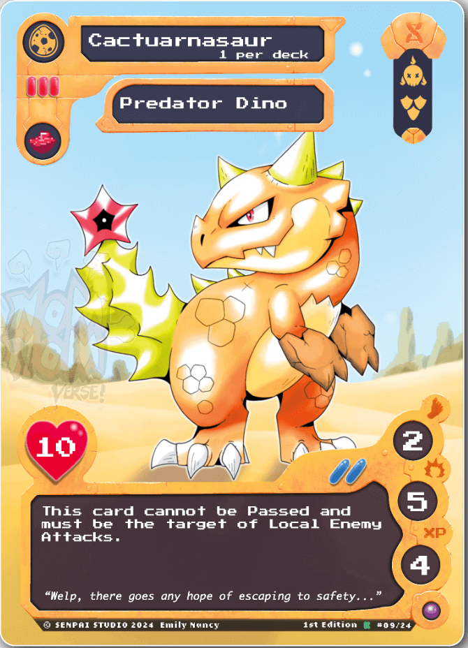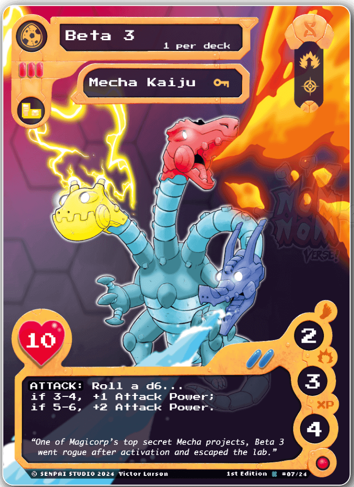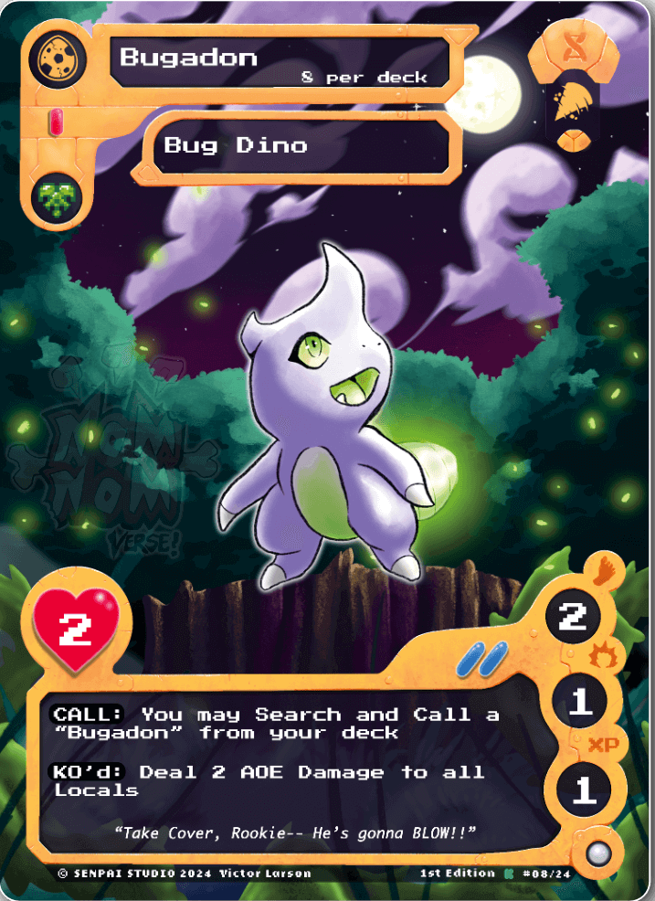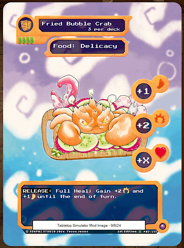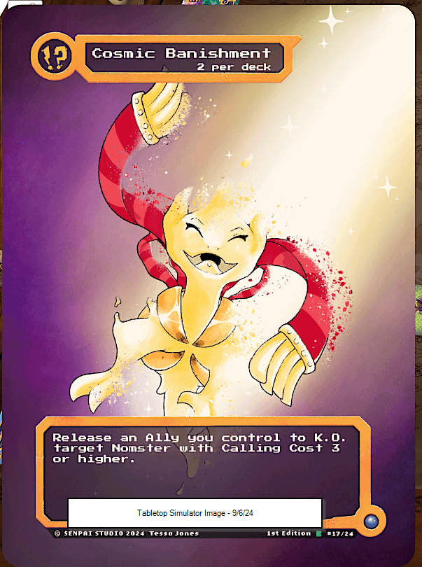 These decks were first seen and made available at Spookala 2024. Demo/Beta versions were printed by Rex3 printers before NomNom moved to a new printed company. Kickstarter pledges that included Starter Decks received copies of these Beta Decks in the Kickstarter Care Packages sent out December 2024.