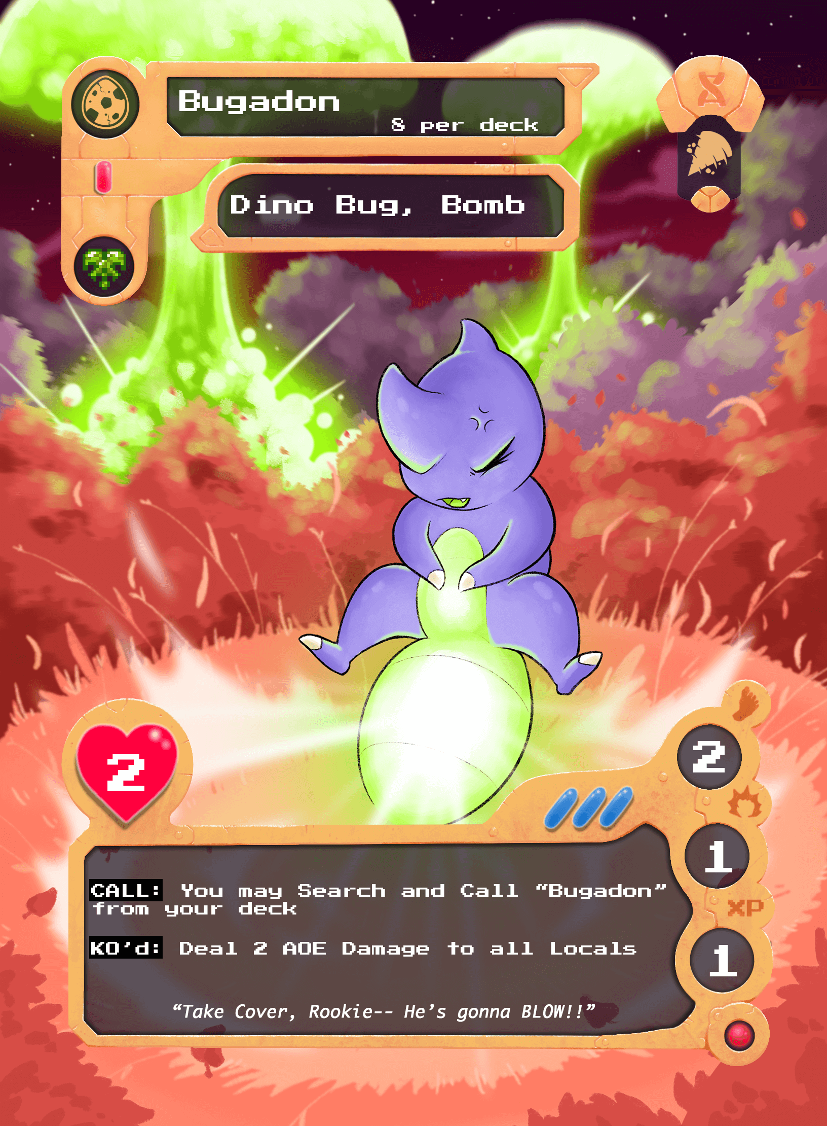 Entry 2: Bugadon! . The lowly Dino is the definition of big things come in small packages! Though very docile and playful, Bugadon contain a very dangerous attribute. When threatened or attacked they combine certain chemicals in their tail or thorax to detonate and explode. They are luckily a dime a dozen, and most creatures of NomNom are aware of their dangerous nature. So for the most part they run free without being bothered or threatened. However, if you don’t watch where you step it could be your last!