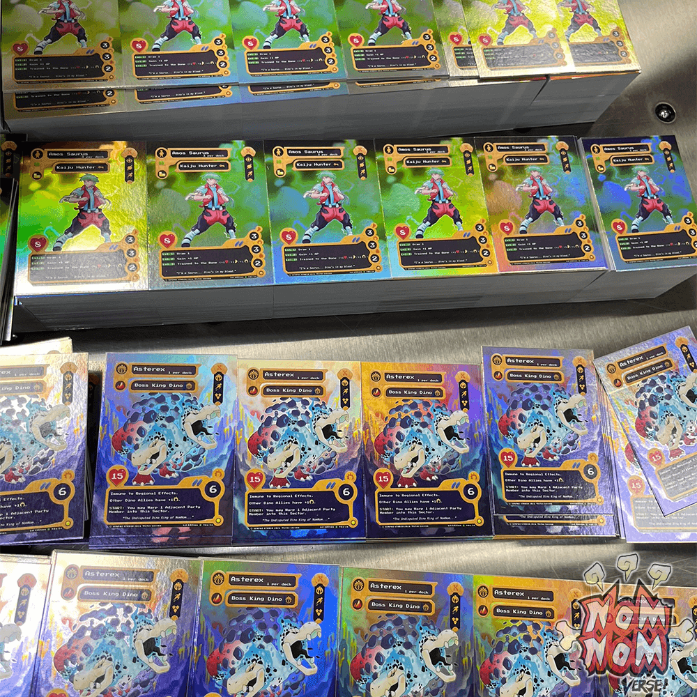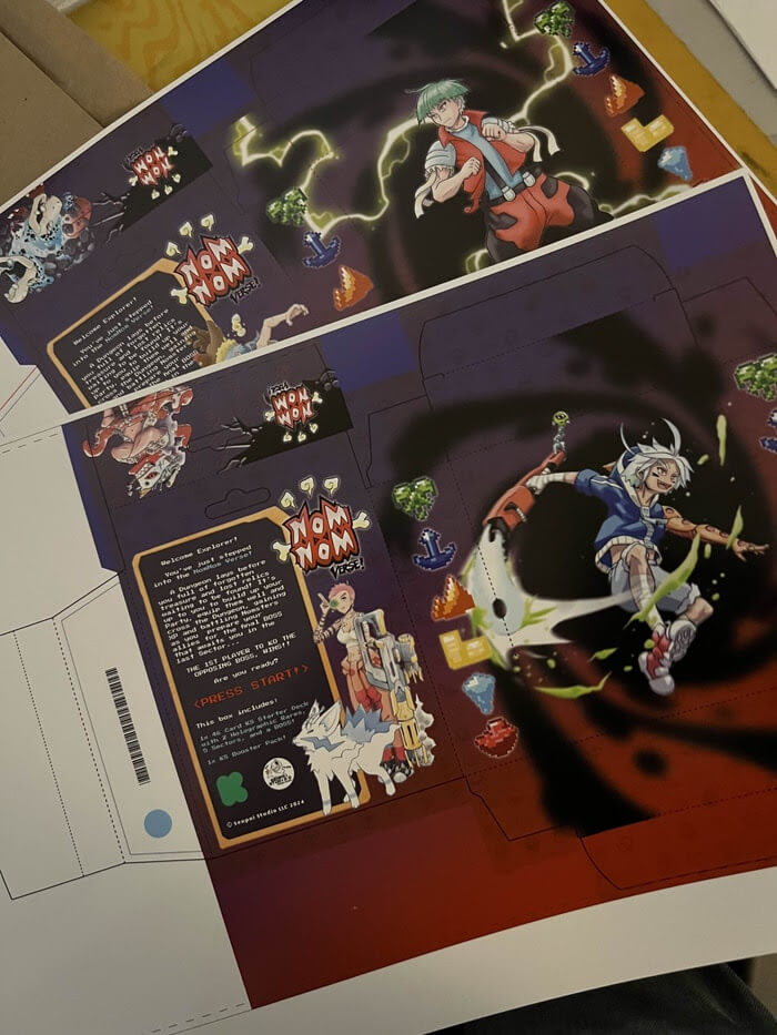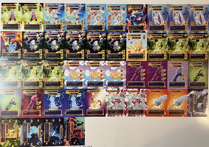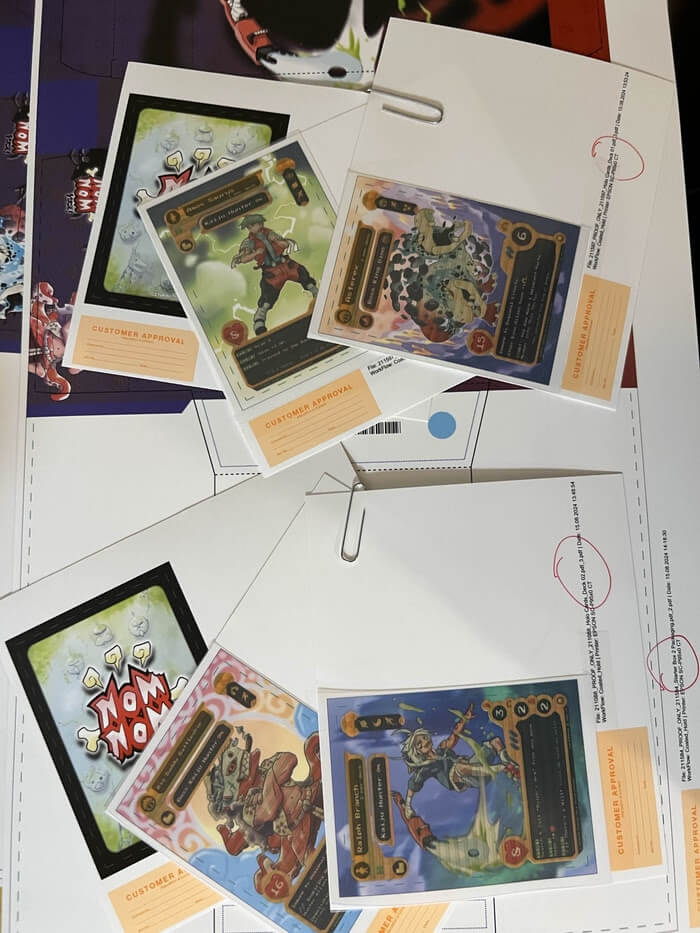 As printing continues on the Kickstarter Base Set, we wanted to show the community some of the proofs sent to us when quality-assuring the Starter Decks! Pictured are Uncut Sheets of both the Ralph and Amos Starter Decks, Color-Proofing for all of the cards, and the layout for the starter deck Boxes!