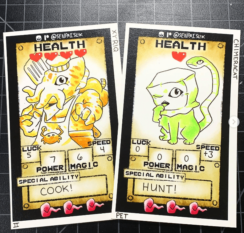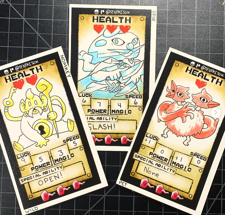These Sketch Cards could be early concepts for the NomNom card game. They were given out as a reward to Senpaislik Studios Patreon members in early 2021. ‘GODS of NOM-NOM’ and ‘GUILD MEMBER’ tiers were mentioned in the Instagram Post in which these were featured. As more information is discovered on these we will be sure to update here!